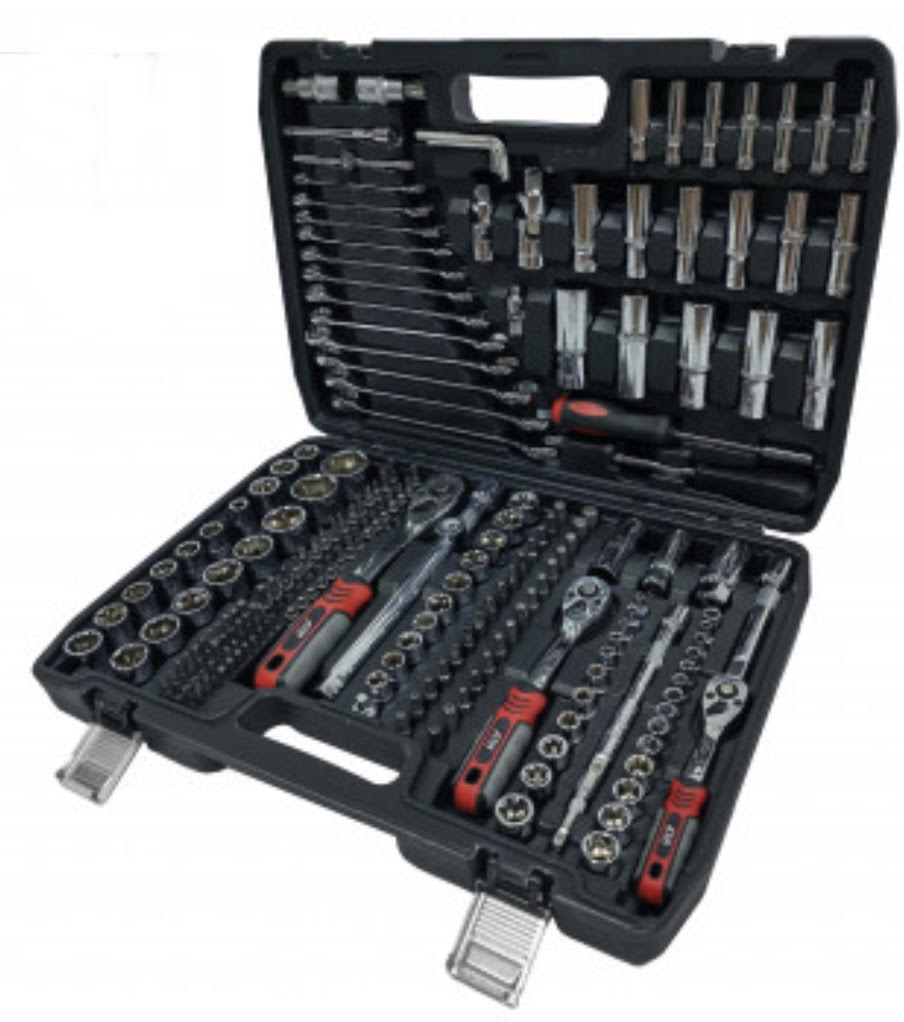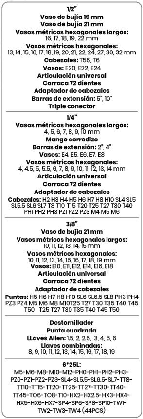 1/2” Vaso de bujía 16 mm Vaso de bujía 21 mm Vasos métricos hexagonales largos: 16, 17, 18, 19, 22 mm Vasos métricos hexagonales: 13, 14, 15, 16, 17, 18, 19, 20, 21, 22, 24, 27, 30, 32 mm Cabezales: T55, T6 Vasos: E20, E22, E24 Articulación universal Carraca 72 dientes Adaptador de cabezales Barras de extensión: 5”, 10” Triple conector 1/4” Vasos métricos hexagonales largos: 4, 5, 6, 7, 8, 9, 10 mm Mango corredizo Barras de extensión: 2”, 4” Vasos: E4, E5, E6, E7, E8 Vasos métricos hexagonales: 4, 4.5, 5, 5.5, 6, 7, 8, 9, 10, 11, 12, 13, 14 mm Articulación universal Carraca 72 dientes Adaptador de cabezales Cabezales: H2 H3 H4 H5 H6 H7 H8 H10 SL4 SL5 SL5.5 SL6 SL7 T8 T10 T15 T20 T25 T27 T30 T40 PH1 PH2 PH3 PZ1 PZ2 PZ3 M4 M5 M6 3/8” Vaso de bujía 21 mm Vasos métricos hexagonales largos: 10, 11, 12, 13, 14, 15 mm Vasos métricos hexagonales: 10, 11, 12, 13, 14, 15, 16, 17, 18, 19 mm Vasos: E10, E11, E12, E14, E16, E18 Articulación universal Carraca 72 dientes Adaptador de cabezales Puntas: H5 H6 H7 H8 H10 SL6 SL6.5 SL8 PH3 PH4 PZ3 PZ4 M5 M6 M8 M10T25 T27 T30 T35 T40 T45 T50 T25 T27 T30 T35 T40 T45 T50 Destornillador Punta cuadrada LLaves Allen: 1.5, 2, 2.5, 3, 4, 5, 6 Llaves combinadas: 8, 9, 10, 11, 12, 13, 14, 15, 16, 17, 18, 19 6*25L: M5-M6-M8-M10-M12-PH0-PH1-PH2-PH3-PZ0-PZ1-PZ2-PZ3-SL4-SL5.5-SL6.5-SL7-TT8-TT10-TT15-TT20-TT25-TT27-TT30-TT40-TT45-TO6-TO8-T10-HX2-HX2.5-HX3-HX4-HX5-HX6-HX7-SP4-SP6-SP8-SP10-TW1-TW2-TW3-TW4 (44PCS)